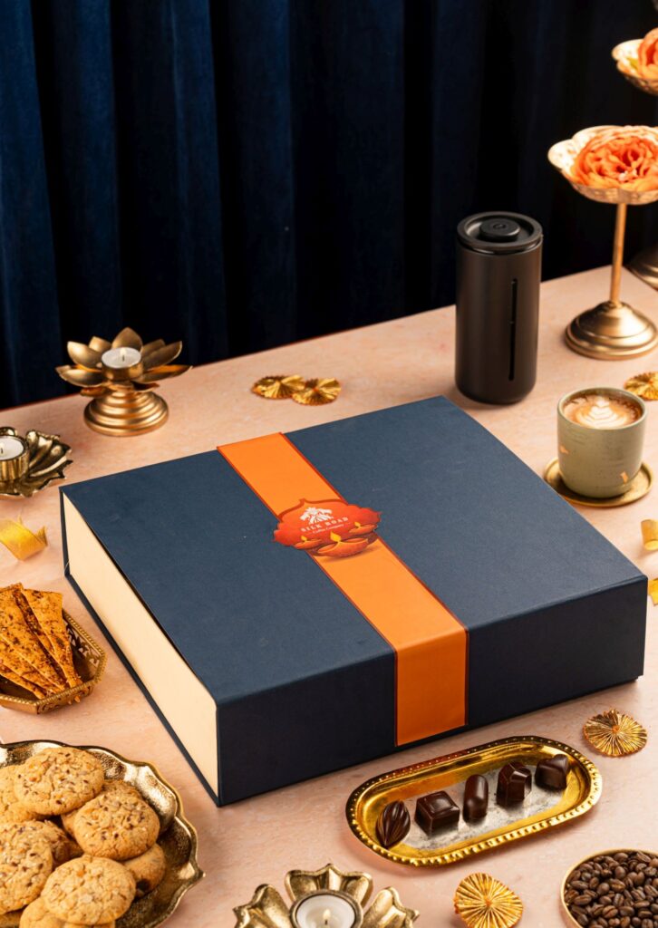 The branding captures the festive spirit of India, while maintaining the global sophistication of a premium coffee brand. The packaging is dominated by vibrant orange and deep blue, a palette that feels festive yet luxurious. The addition of golden accents in the form of props, ribbons, and candle holders enhances the celebratory theme, making the unboxing experience feel like part of the festival itself.